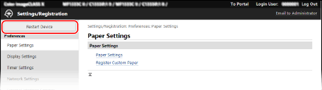 เมื่อคุณดำเนินการเปลี่ยนแปลงการตั้งค่าโดยใช้แผงควบคุมหรือ Remote UI คุณสามารถรีสตาร์ตเครื่องโดยใช้สวิตซ์เปิด/ปิดเครื่องหรือ Remote UI
