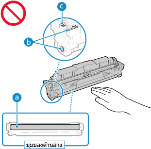 ตรวจสอบให้แน่ใจว่าจับตลับผงหมึกโดยใช้ที่จับ อย่าทำให้พื้นผิวของลูกดรัมเกิดรอยขีดข่วน (  ) หรือถูกแสงสว่าง ห้ามสัมผัสหน้าสัมผัสไฟฟ้า (  ) หรือหน่วยความจำของตลับผงหมึก (  ) |