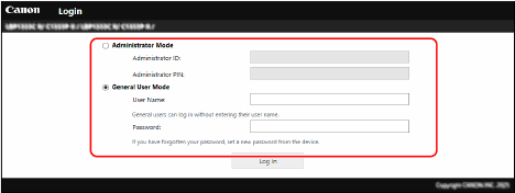 หากต้องการใช้ Remote UI ให้ใส่ที่อยู่ IP ของเครื่องลงในเว็บเบราว์เซอร์บนคอมพิวเตอร์ และเข้าสู่โหมดผู้ดูแลระบบหรือ General User Mode ฟังก์ชันที่ใช้งานได้กับ Remote UI จะแตกต่างกันไปตามโหมดที่คุณลงชื่อเข้าใช้
