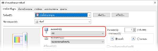 ใน [ขนาดกระดาษ] บนแท็บ [การตั้งค่าพื้นฐาน] ให้เลือกขนาดกระดาษของเอกสาร