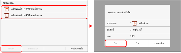 เลือกงานที่จะยกเลิกใน [สถานะงานพิมพ์] แล้วกด