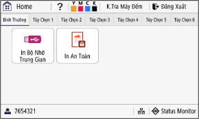 Trạng thái của máy được hiển thị ở phía trên cùng và dưới cùng của màn hình để xem nhanh và thực hiện thao tác, nếu cần.