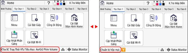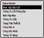 Màn hình này được hiển thị khi bạn nhấn [Status Monitor] trên màn hình [Home] và các vị trí khác. Sử dụng màn hình này để kiểm tra thông tin của máy, việc sử dụng và nhật ký, cài đặt mạng và thông tin lỗi.