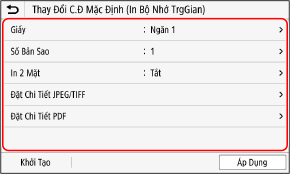 Khôi Phục Cài Đặt Mặc Định Thành Cài Đặt GốcTrên màn hình ở Bước 3, nhấn [Khởi Tạo]  [Có]. |