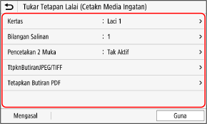 Untuk model panel sentuhan, anda juga boleh menetapkan semula tetapan kepada tetapan yang ditetapkan di sini dengan menekan [Set Semula] pada skrin tetapan cetakan.