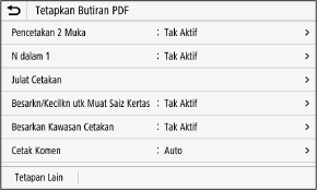 [Cetak Komen] Tentukan sama ada hendak mencetak dokumen PDF. Apabila anda memilih [Auto], dokumen dan komen *1 dicetak. *1 Hanya komen yang dipilih untuk dicetak dalam fail PDF. |