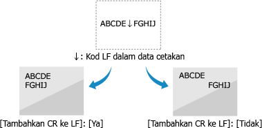 [PCL]Pilih sama ada mahu menambahkan kembalian penyorong (CR) apabila mesin menerima kod suapan garisan (LF). Jika [Ya] dipilih, kedudukan cetakan bergerak ke permulaan garisan yang seterusnya apabila mesin menerima kod LF. Jika [Tidak] dipilih, kedudukan cetakan bergerak ke garisan yang seterusnya, betul-betul di bawah kod LF yang diterima. |