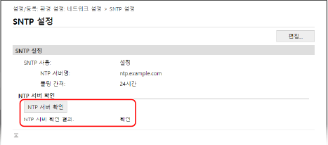 다음 절차를 사용하여 통신을 테스트합니다. 기기가 서버와 올바르게 통신하면 [NTP 서버 확인 결과]에 [확인]가 나타납니다.