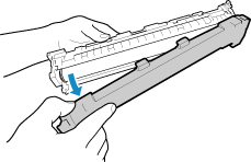 务必使用把手来抓住一体式鼓粉盒。 请勿刮擦感光鼓表面 (  ) 或让光线照射。另外,请勿触摸电触点 (  ) 或一体式鼓粉盒存储器 (  )。 |
