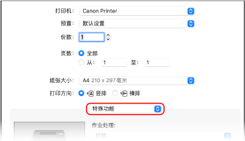 从打印选项弹出菜单中,选择 [特殊功能]。