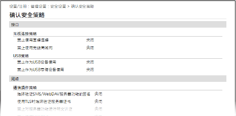 在其他设备或软件中设置的内容将应用于机器的安全策略。因此,安全策略中的有些功能项目可能无法在机器上使用,但这不会影响机器的设置或操作。