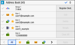 When you call the Address Book from the [Home] screen or scan or fax screen, the following screen is displayed.
