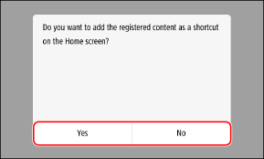 When you select [No], the Favorite Setting is registered but a shortcut button is not added. You can add a shortcut button to the [Home] screen at a later time. Adding Shortcut Buttons
