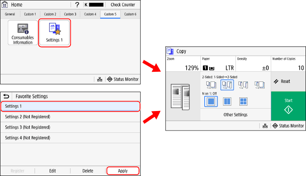 You can call up registered settings for quick operation using the shortcut buttons added to the [Home] screen on the control panel and the screen of each function. You can also change the settings after calling them up, as needed.