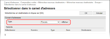 Dans [Type], sélectionnez [Favoris] ou [Composition codée], et cliquez sur [Afficher] pour changer l'affichage du carnet d'adresses.