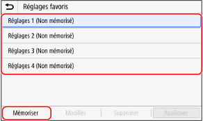 Utilisez le panneau de commande pour enregistrer les paramètres favoris. Vous ne pouvez pas enregistrer les paramètres favoris en utilisant l’interface utilisateur distante depuis un ordinateur.