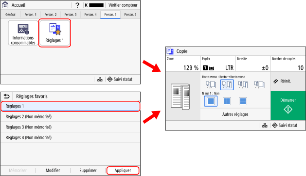Vous pouvez appeler les paramètres enregistrés pour des opérations plus rapides en utilisant les boutons de raccourci ajoutés à l’écran [Accueil] du panneau de commande et à l’écran de chaque fonction. Vous pouvez également modifier les paramètres après les avoir appelés, si nécessaire.