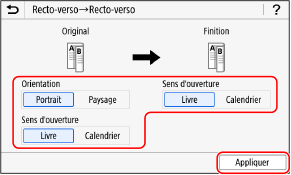 Définissez l'orientation de l'original et le type d'ouverture, ainsi que le type d'ouverture de la copie, comme requis.