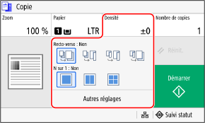 En plus des paramètres de copie de base, la machine dispose également de paramètres de copie recto-verso, de réglage de la qualité d'image et d'autres paramètres en fonction de votre original et de vos besoins. Utilisez l'écran de copie pour configurer ces paramètres.