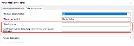 Dans l'onglet [Saisir la destination], saisissez un numéro de fax. Si le champ [Confirmer le numéro de fax (empêcher l'envoi à une mauvaise destination)] peut être renseigné, saisissez-y le même numéro de fax.