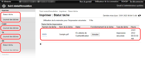 Depuis Suivi statut/Annulation dans l'interface utilisateur distante, vous pouvez vérifier l'état et les journaux d'une fonction, l'état d'utilisation de l'appareil et les informations sur les erreurs.