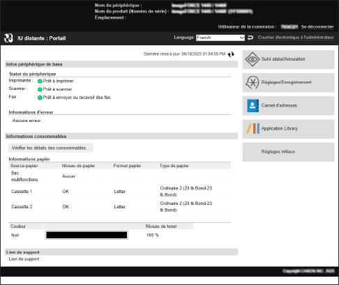 Lorsque vous vous connectez à l'interface utilisateur distante, la page Portail (page d'accueil de l'interface utilisateur distante) s'affiche. Depuis cette page, vous pouvez vérifier l'état d'utilisation de l'appareil, afficher diverses informations et changer les paramètres au moyen de boutons.
