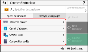 Spécifications des destinatairesUtilisez [Carnet d'adresses] ou [Composition codée] pour spécifier les destinataires de Cc et de Cci.