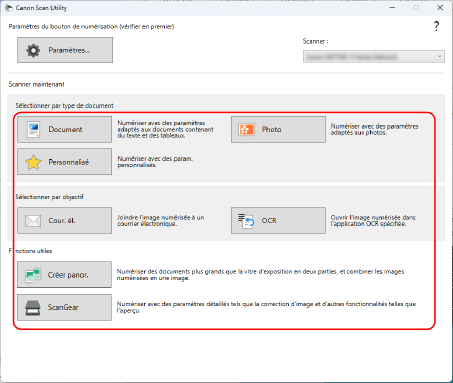 Cliquez sur [ScanGear] pour afficher ScanGear MF et configurer les paramètres de numérisation avancés. Pour plus d'informations, cliquez sur [