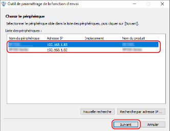 Si l'appareil n'est pas affiché dans [Liste des périphériques ], cliquez sur [Nouvelle recherche]. Si l'appareil n'est toujours pas affiché, cliquez sur [Recherche par adresse IP], saisissez l'adresse IP de l'appareil, puis cliquez sur [OK].
