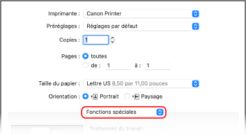 2 | Dans le menu contextuel des options d'impression, sélectionnez [Fonctions spéciales]. Si les options d’impression ne s’affichent pas, cliquez sur [Afficher les détails] dans la boîte de dialogue d’impression. |