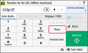 Lors de l’envoi d’un fax vers une destination internationale, saisissez le numéro d’accès international, l’indicatif de pays et le numéro de fax de la destination dans cet ordre. Appuyez sur [Pause] entre les numéros pour ajouter une pause.