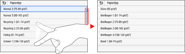 Bewegen Sie Ihre Fingerspitze, während Sie den Bildschirm berühren, und lassen Sie sie an der gewünschten Stelle los. Sie können in Listen blättern und den Bereich, den Sie berühren, an die gewünschte Position verschieben.