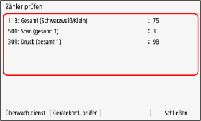 Auf dem Prüfzählerbildschirm verfügbare VorgängeWelche Elemente auf dem Bildschirm angezeigt werden, hängt von Ihrem Land bzw. Ihrer Region ab. Drücken Sie [Überwach.dienst], um die Verbindung zum Überwachungsserver zu prüfen. Führen Sie diesen Vorgang aus, um die Informationen des Geräts regelmäßig an den Überwachungsserver zu senden. Drücken Sie [Gerätekonf. prüfen], um die Konfiguration der Optionen auf dem Gerät zu überprüfen.