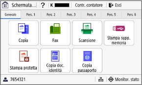 ![]() | [Impostaz. sch. princ.] Consente di aggiungere i pulsanti di collegamento alla schermata [Schermata princip.] e di modificare la disposizione dei pulsanti. Personalizzazione della schermata [Schermata princip.] | |