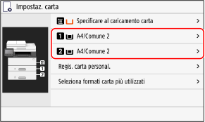 Per impostazione predefinita, il formato e il tipo di carta del cassetto della carta sono impostati su A4 e Comune 2. Quando viene caricata carta con un formato o tipo diverso, modificare le impostazioni della carta.
