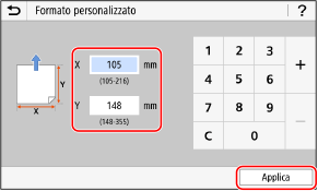 2 | Inserire i valori in [X] e [Y] e premere [Applica]. Quando si registrano formati non standard utilizzati di frequente, è possibile richiamarli premendo da [S1] a [S3]. |