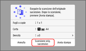 1 | Posizionare l'originale successivo sul vetro di lettura e premere [Scansione orig. successivo]. L’originale successivo viene acquisito e viene visualizzata la stessa schermata. Ripetere la procedura fino ad acquisire tutti gli originali. È inoltre possibile premere [Densità] e [Tipo originale] per modificare le impostazioni di ciascun originale. Se il formato dell'originale è diverso, l'immagine potrebbe non essere riprodotta per intero oppure potrebbe essere stampata in un formato più piccolo sul foglio. |