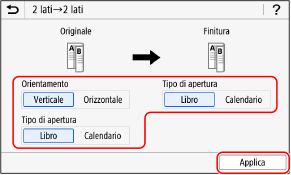 Impostare l’orientamento, il tipo di apertura dell’originale e il tipo di apertura della copia, in base alle proprie esigenze.
