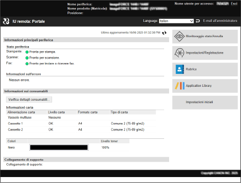 Quando si accede alla IU remota, viene visualizzata la pagina portale (prima pagina della IU remota). Da qui è possibile verificare lo stato operativo della macchina, visualizzare varie informazioni e modificare le impostazioni mediante l’utilizzo dei pulsanti.