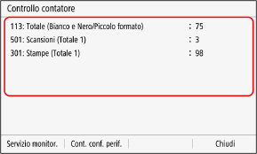 Operazioni disponibili nella schermata Controlla contatoreLe voci visualizzate sullo schermo variano in base al paese o all'area geografica. Premere [Servizio monitor.] per verificare la connessione al server di monitoraggio. Eseguire questa operazione per inviare le informazioni della macchina al server di monitoraggio con regolarità. Premere [Cont. conf. perif.] per verificare la configurazione di opzioni sulla macchina.
