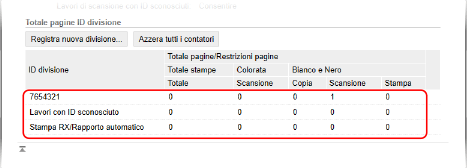 È possibile visualizzare il numero di pagine stampate e copiate per ciascun ID reparto quando la gestione ID reparto è abilitata.