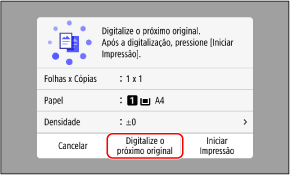 Quando um original é colocado no vidro de exposição e é copiado com a cópia frente e verso ou N em 1, é apresentado o ecrã para digitalizar o original seguinte.