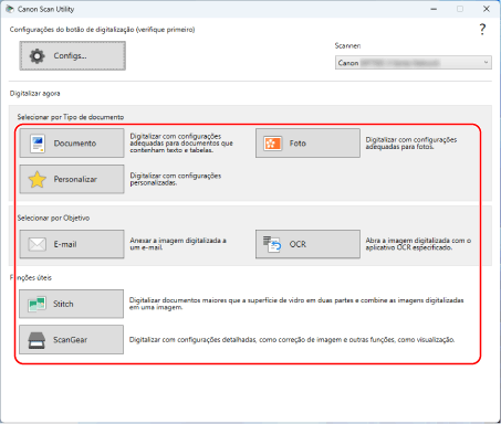 Selecione o controlador de scanner (ScanGear MF ou WIA) da máquina e configure as definições de digitalização.