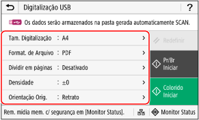 Se o ecrã de operação de suporte de memória for apresentado, prima [Digitalização USB] e avance para o passo 5.
