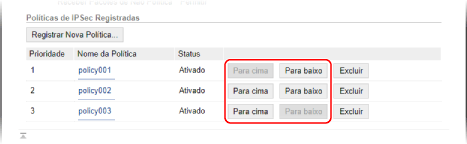 Clique em [Para cima] ou [Para baixo] à direita do nome da política para definir a prioridade. As políticas de nível superior têm prioridade na aplicação à comunicação IPSec.