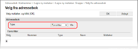 I [Type] velger du [Favoritter] eller [Kortnummer] og klikker så på [Vis] når du vil endre visning for adresseboken.