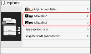 Som standard er papirformat og -type for papirskuffen stilt inn til A4 og Vanlig 2. Når papir med et annet format eller -type legges i, må du endre papirinnstillinger.