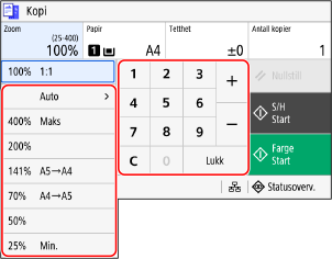 Zoomen stilles inn automatisk i henhold til formatet for papiret som brukes til kopieringen.