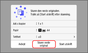 1 | Legg den neste originalen på glassplaten og trykk på [Skann neste original]. Den neste originalen skannes og samme skjermbilde vises. Gjenta denne prosessen til alle originalene er skannet. Du kan også trykke på [Tetthet] og [Originaltype] når du vil endre innstillingene for hver original. Hvis formatet for originalen er annerledes, kan deler av bildet mangle eller bildet kan bli skannet mindre på papiret. |