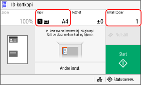 * Når du utfører kopier med funksjonen ID-kortkopi, er zoomen fast på 100 %.